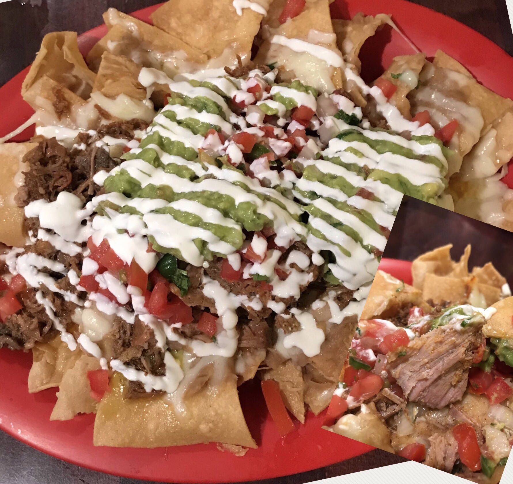 I almost always order the same thing…the loaded nachos with carnitas for $9.95. They are mouthwatering. I literally crave them at times. The pork is shredded with big chunks of meat found throughout the plate (see blown up pic below in pic collage). The nachos are smothered in refried beans, cheese, guacamole, sour cream and pico de gallo. The chips are house made and served crunchy and warm. I love adding their house made hot sauces. They offer a tomatillo and a chipoltle option. I love both and I use both. Use the chipoltle cautiously though…it’s hot both at the time you eat it and the next day (if you get my drift). It’s true folks. I gotta let you know but I also have to let you know that, to me, its worth it.