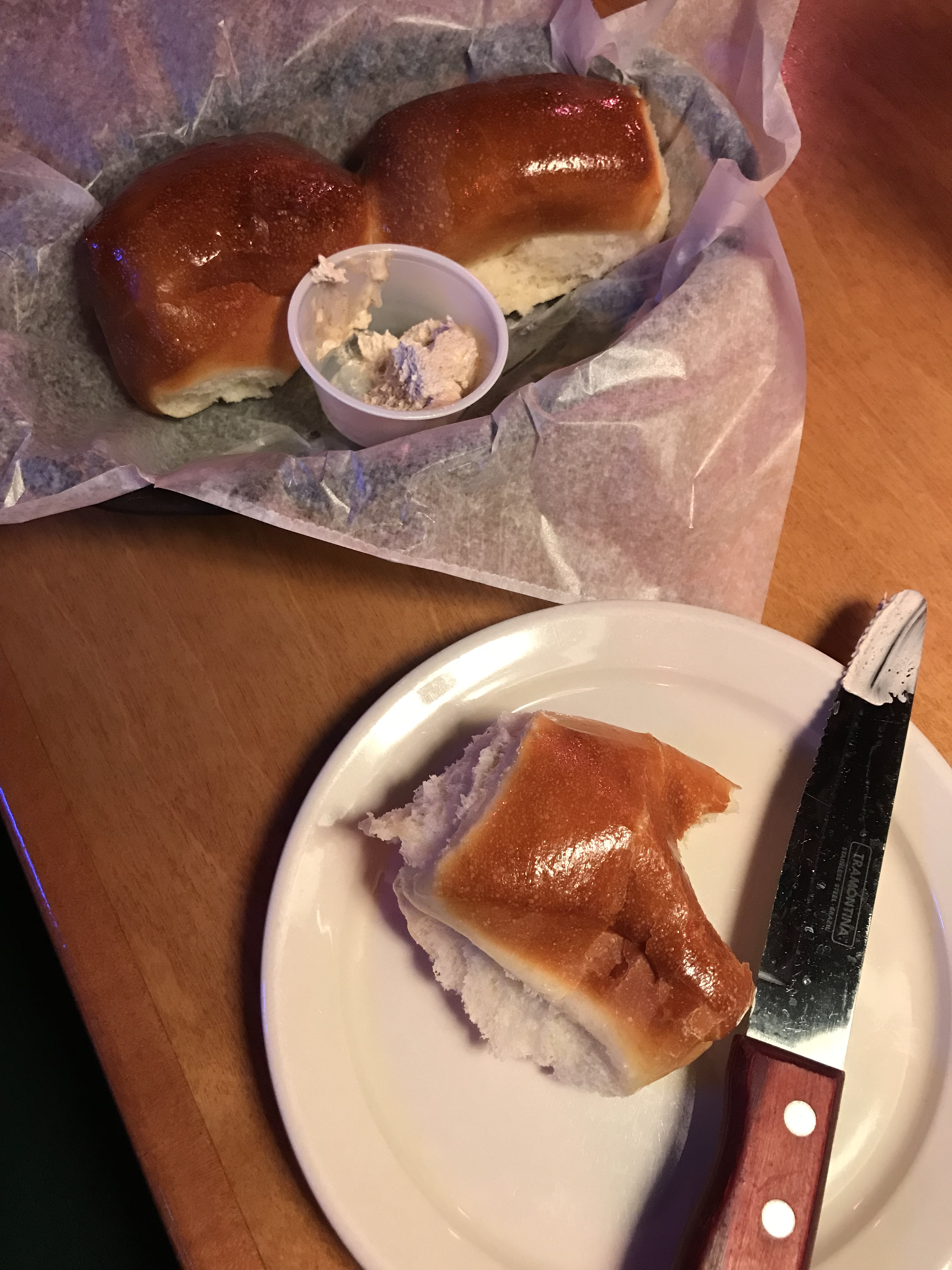 The meal started with warm, shiny, soft rolls with a creamy, cinnamon butter. All you can eat on these little suckers but my 46 year old bod said stop at just one.