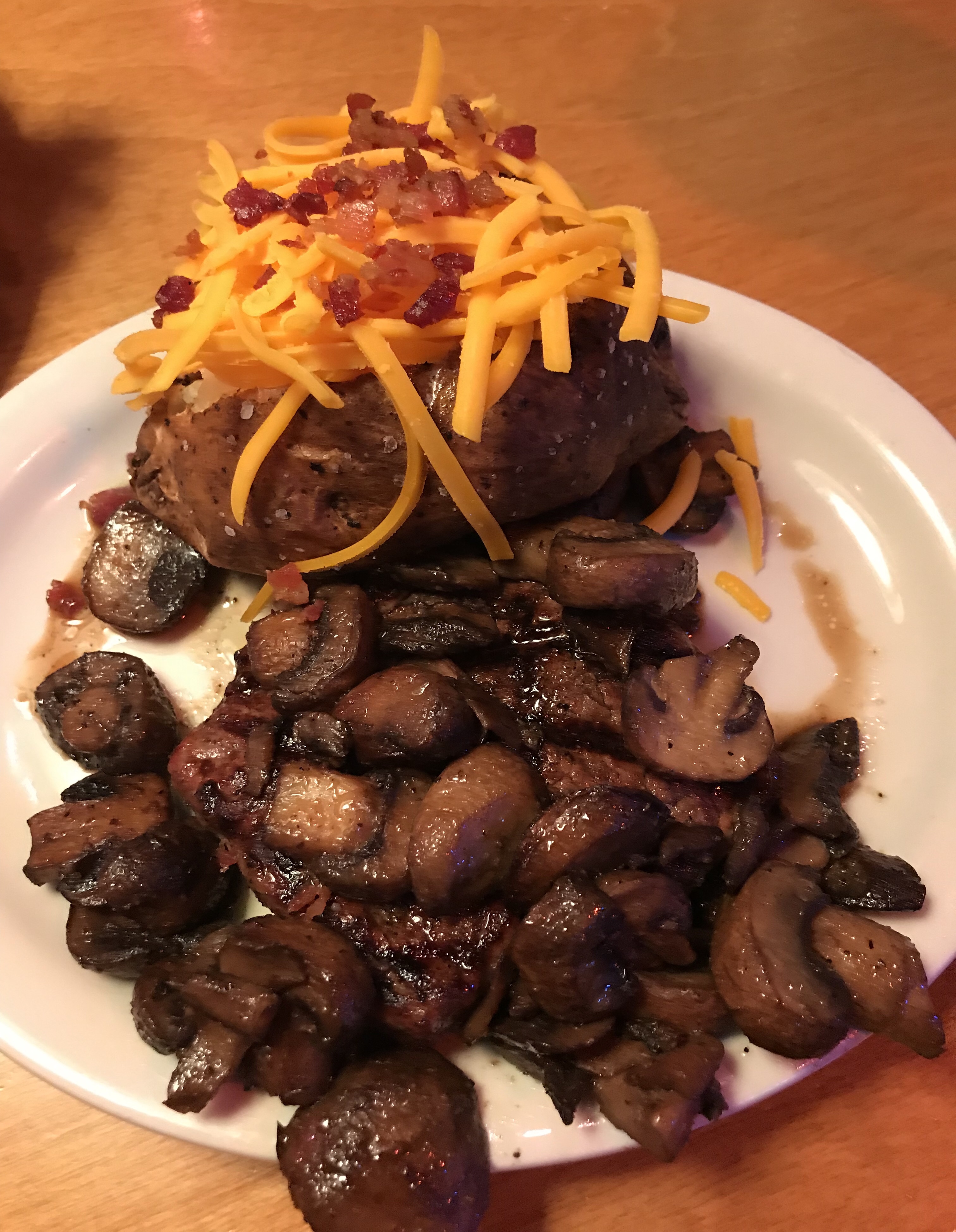 I ordered the smaller option of their New York Strip. It was a 8 oz. thick cut New York Strip smothered in sauteed mushrooms and a loaded baked potato. It was $14.99 for my meal plus an extra $1.99 for mushrooms. Isn’t that nuts! What a deal. The mushrooms were so flavorful and they added so much to the dish but you do have to be a mushroom lover because when they say smother, they mean smother. Note you can also get your steak smothered with sauteed onions, jack cheese or brown gravy….any combination of the 4 toppings that is for a measly $1.99. You couldn’t even see my steak they gave me so many mushrooms but believe me, it was there and it was cooked just as I requested.