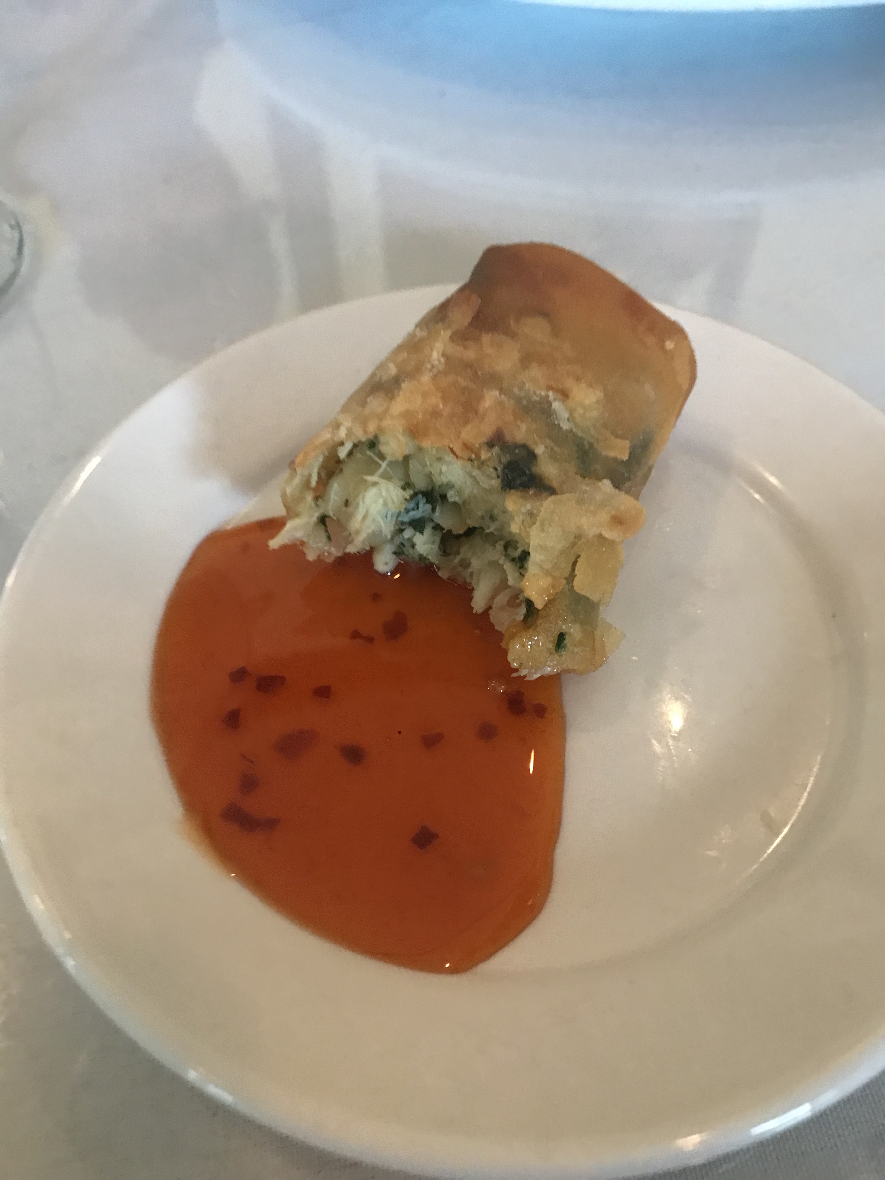 We shared a seafood stuffed egg roll appetizer. It was crispy and delicious. It was served with a sweet and tangy Asian style dipping sauce which complimented it nicely. It was a generous portion and perfectly prepared. Yummm I would order again.