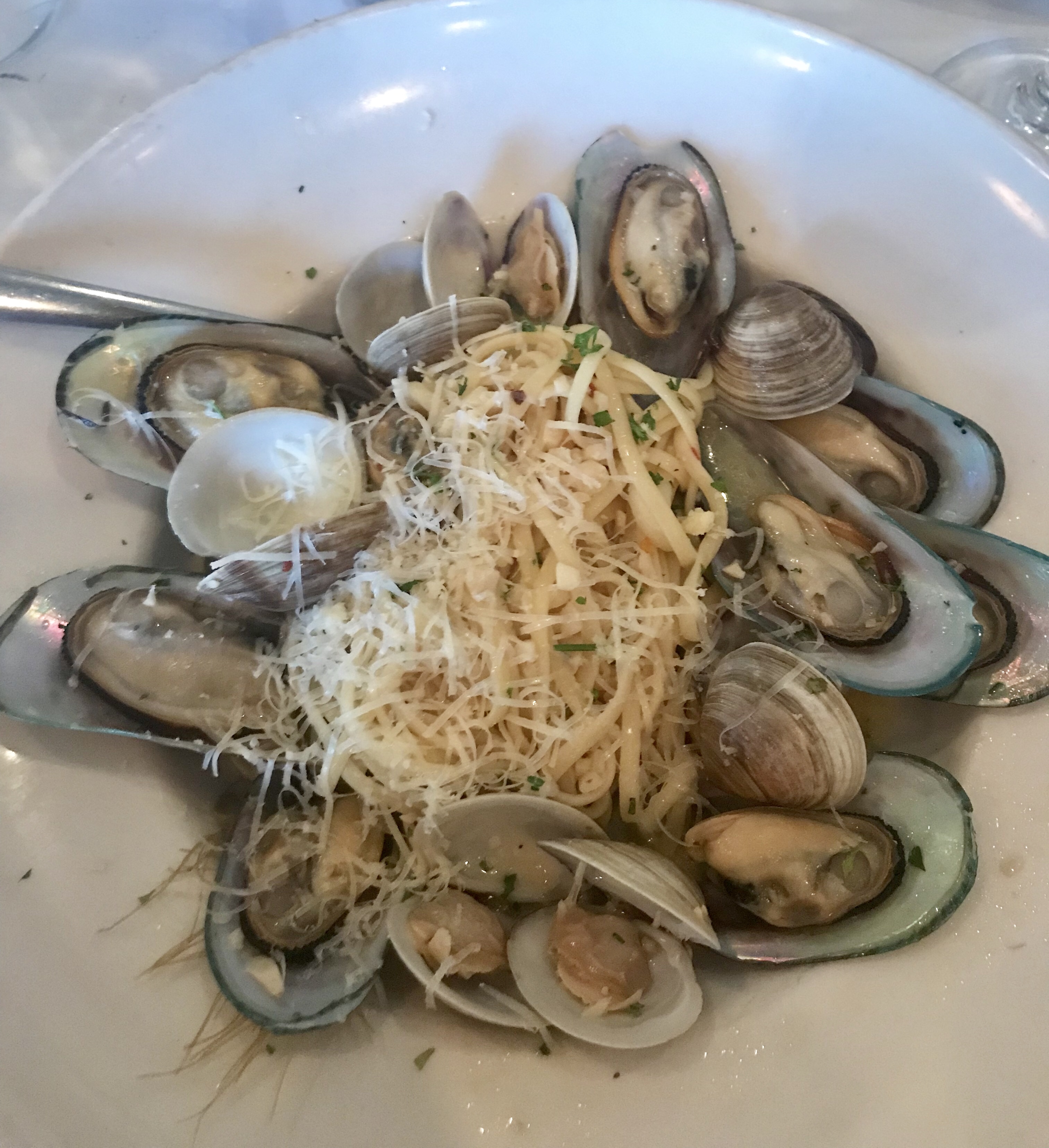 I had linguini with mussels and clams in white sauce. The pasta, sauce and clams were devine. After a few bites the mussels became questionable. Some were nice but others were mushy. Also there was one mussel that was not cleaned properly (see the bottom left mussel in my picture). It had the hard hairs still attached to it. Please if you can’t remove them, toss it and don’t put it on the plate. It grossed me out. I don’t know that I would order mussels here again based on this experience. I want to know that each mussel I put in my mouth is going to be good, not take a gamble.