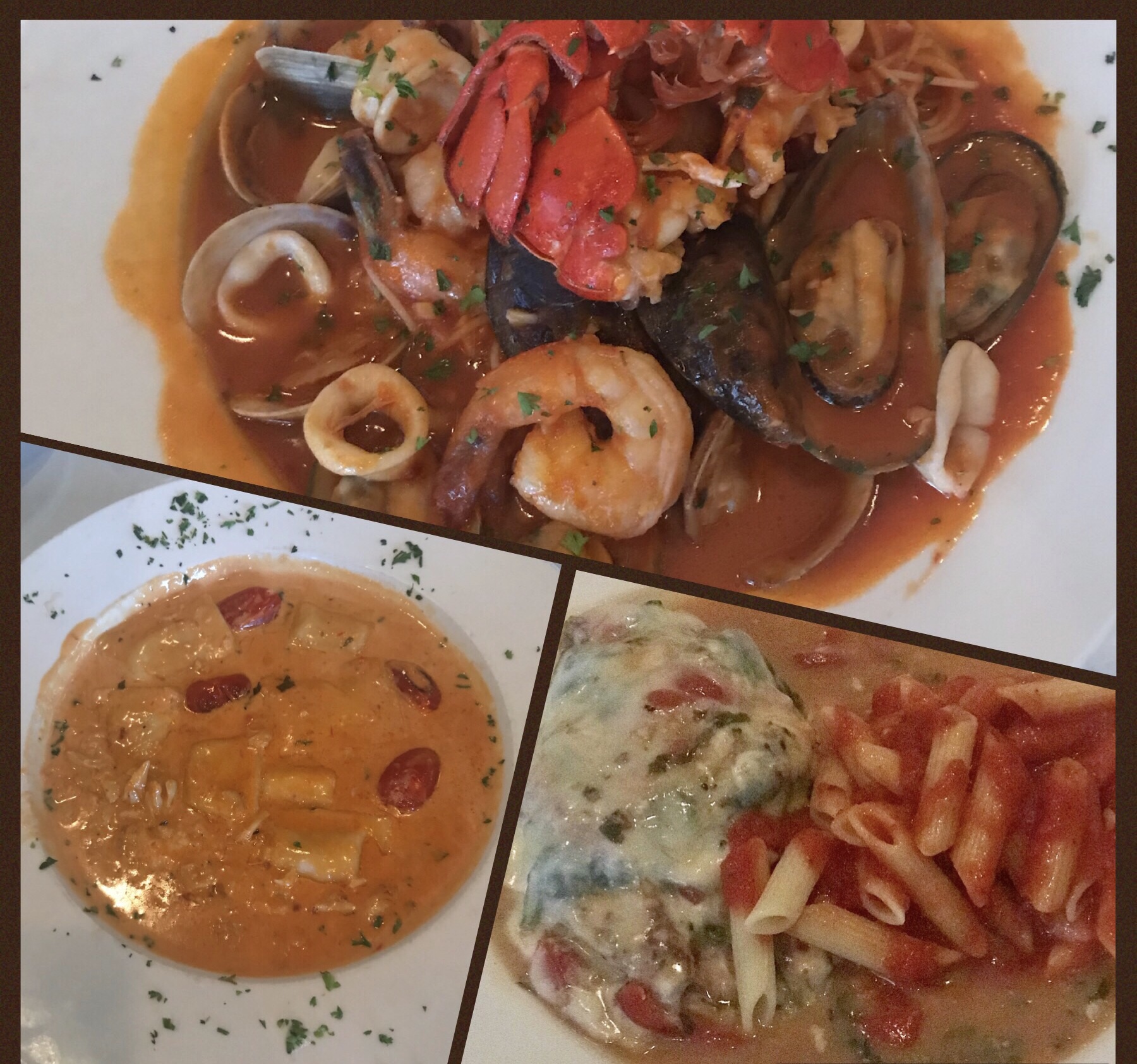 So not to bore you too much I decided to put a collage together of the dishes my husband and neighbors enjoyed. No one complained and all said their food tasted good. Dan had the lobster ravioli (looks a little too saucy to me), my neighbors had the spaghetti with seafood and a chicken dish with a side of pasta. I try not to be too annoying to eat with so I didn’t ask too many questions so pics is all your gonna get regarding their dishes.