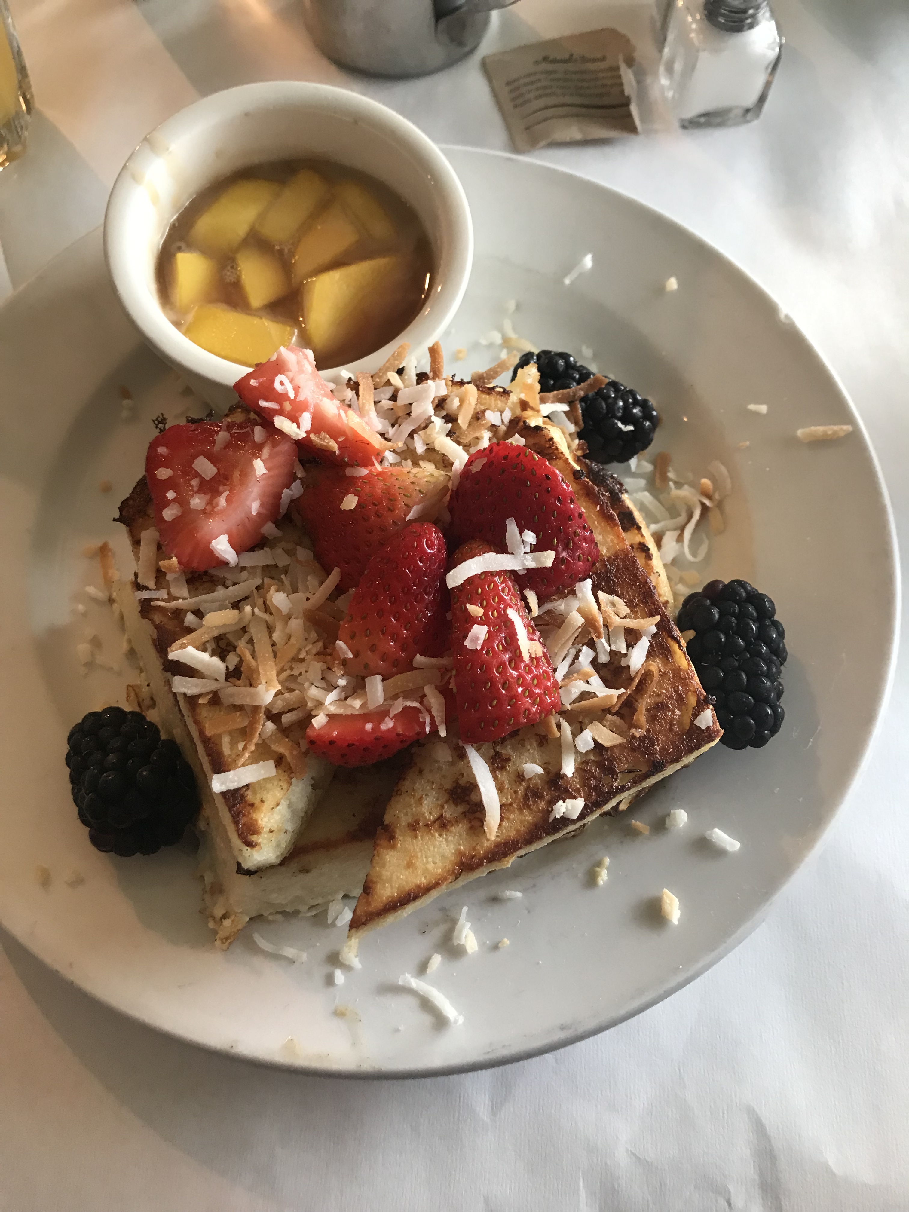 Below is one of the most delicious offerings on their menu. I highly recommend this for breakfast or brunch. They are famous for it at least they are with us. It is Thick Sliced Coconut French Toast with French or Honey Whole Wheat Bread served with Fresh Blackberries & Strawberries and their Home Made Caramelized Mango Sauce on the side. Dan ordered this (as he has many times as well as me). It is so unique and wonderful…simply a masterpiece.
