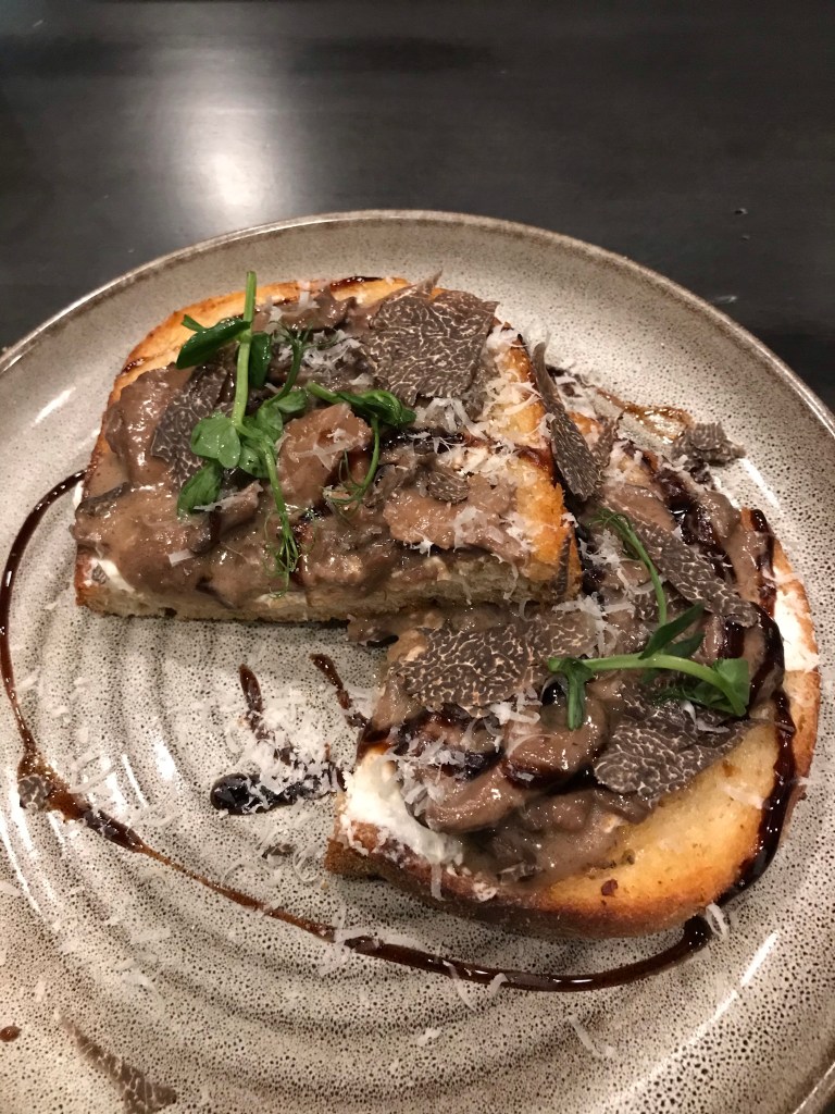 The Hubs ordered the Butcher’s Cut which was a filet mignon. It was served with locally sourced, shallot butter, house made steak sauce, truffle fries and arugula salad. The plate looked nice but the filet was overcooked. He ordered medium but there was no pink inside. The Hubs isn’t a complainer but I could tell he was a bit disappointed.
